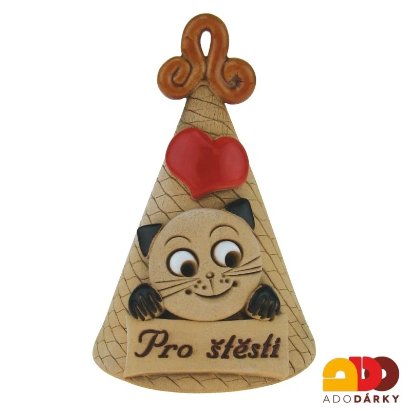 Roztomilý keramický zvoneček ve tvaru kuželu, na kterém je plasticky vymodelovaná kočička, pod kterou je nápis" Pro štěstí". Ideální dárek jen tak pro radost, který obdarovanému přinese spoustu štěstí.