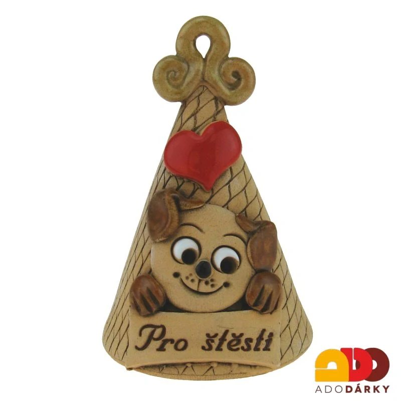 Roztomilý keramický zvoneček ve tvaru kuželu, na kterém je plasticky vymodelovaný pes a pod ním je nápis" Pro štěstí". Ideální dárek jen tak pro radost, který obdarovanému přinese štěstí.