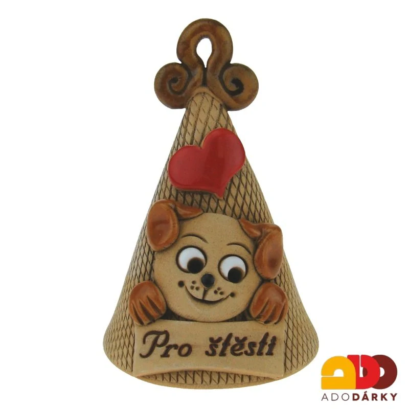Roztomilý keramický zvoneček ve tvaru kuželu, na kterém je plasticky vymodelovaný pes a pod ním je nápis" Pro štěstí". Ideální dárek jen tak pro radost, který obdarovanému přinese štěstí.