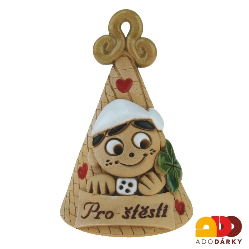 Roztomilý keramický zvoneček ve tvaru kuželu, na kterém je plasticky vymodelovaný kominík držící čtyřlístek a knoflík a cedulku s nápisem: "pro štěstí" Ideální dárek jen tak pro radost, který obdarovanému přinese spoustu štěstí.
