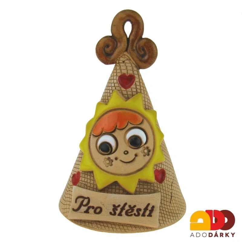 Roztomilý keramický zvoneček ve tvaru kuželu, na kterém je plasticky vymodelované sluníčko se srdíčkem a cedulkou s nápisem: "pro štěstí" Ideální dárek jen tak pro radost, který obdarovanému přinese spoustu štěstí.